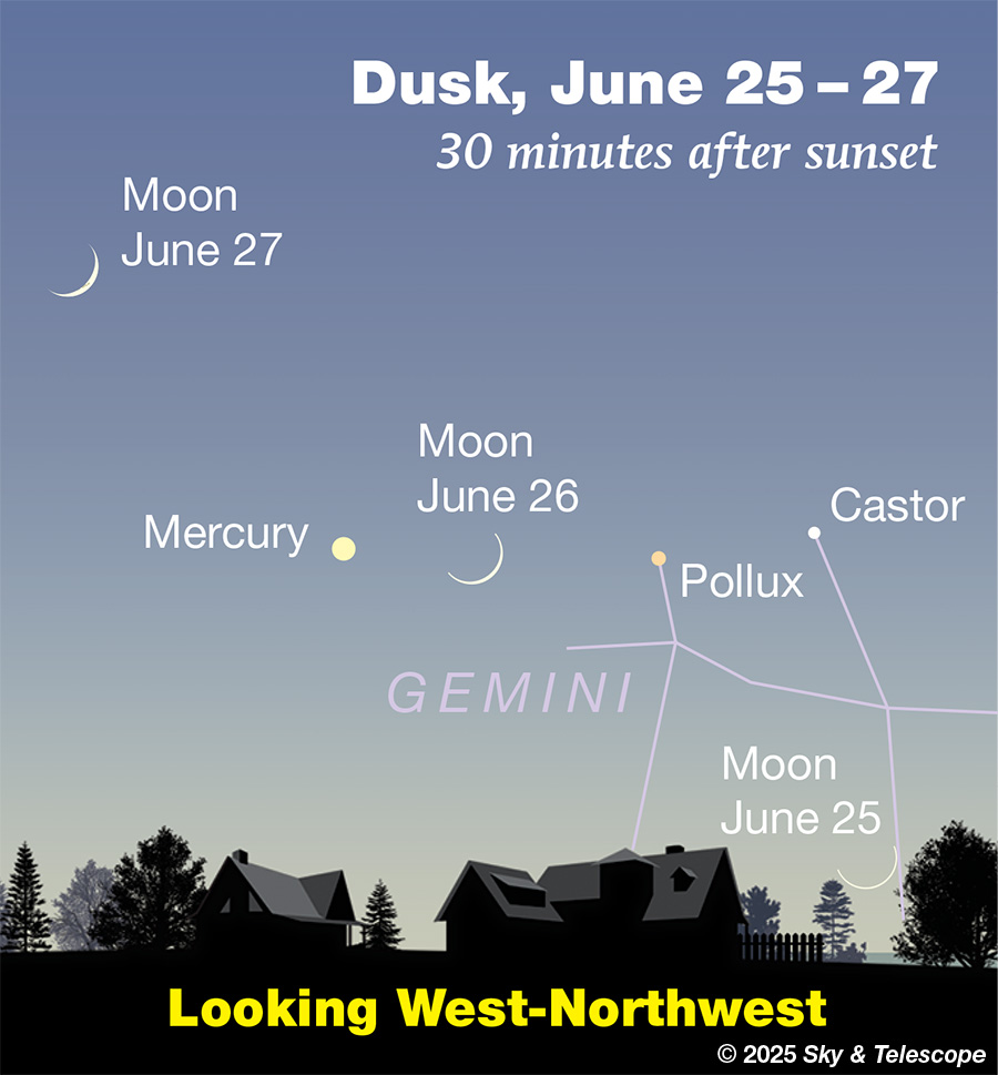 پس از غروب، هلال باریک ماه را در آسمان غرب-شمالغرب خواهید یافت، و اندکی سمت چپ آن، سیاره تیر (عطارد) را که رو به کمنور شدن میرود. اگر خوششانس باشید، شاید دوپلوکس (پولاکس) و دوپیکر (کاستور) را نیز در دوردست ببینید.