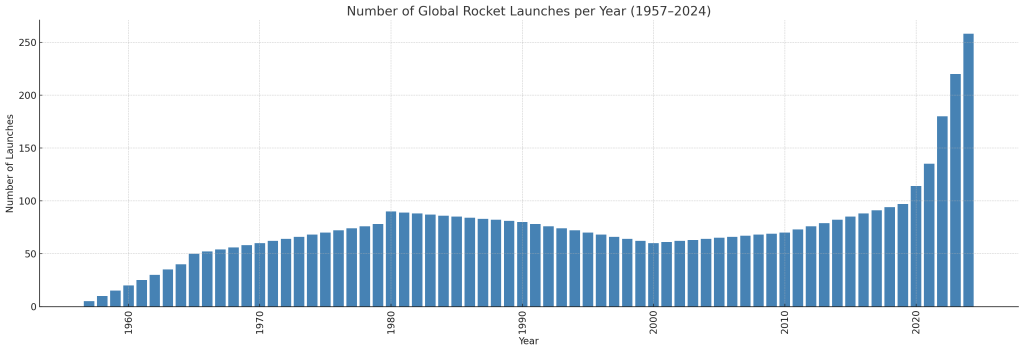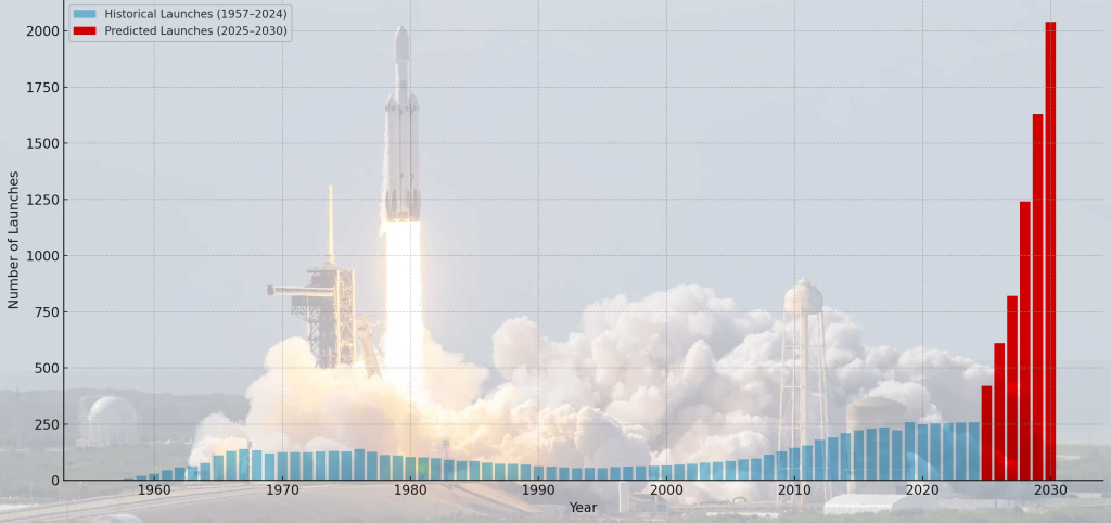 در سال ۲۰۱۹، تنها ۹۷ پرتاب مداری در سطح جهان انجام شد. این عدد در سال ۲۰۲۴ به ۲۵۸ رسید و پیشبینیها نشان میدهد که ممکن است تا سال ۲۰۳۰ به بیش از ۲۰۰۰ پرتاب در سال برسد—یعنی هشت برابر مقدار فعلی. بیشتر این پرتابها به شکل ماهوارههای منظومهای (constellations) در مدار پایین زمین انجام میشود.