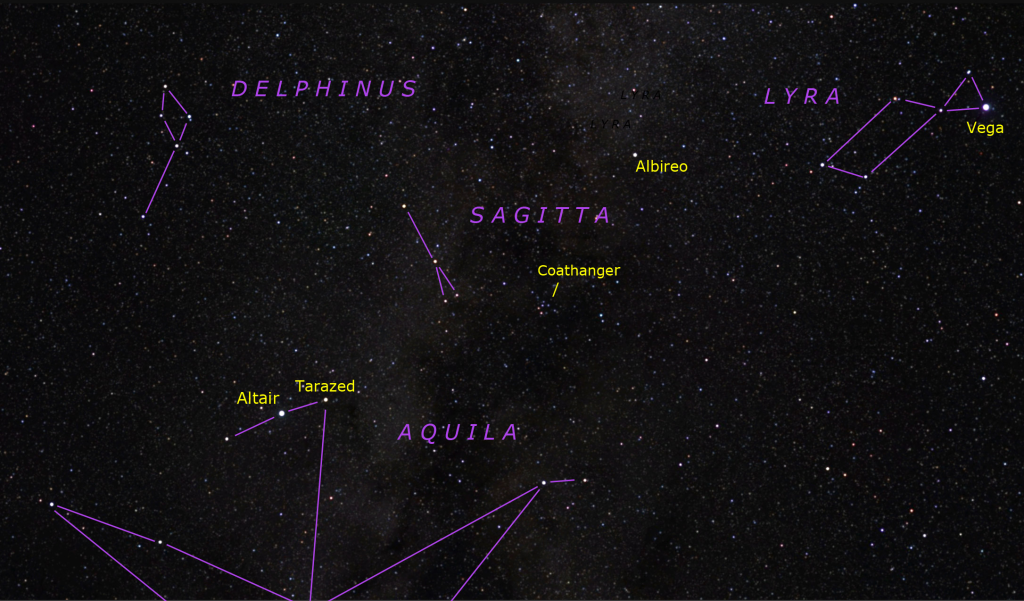 بالای اَلتایر، دو صورت فلکی ظریف اما زیبا پنهاناند: «دِلفینوس» (دلفین) در سمت چپ بالا و «ساگیتا» (تیر یا سهم) در سمت راست بالا. اگر آلودگی نوری زیاد است، دوربین دوچشمی را فراموش نکنید!