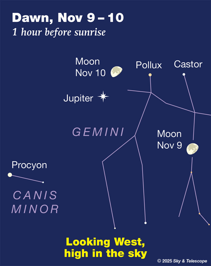 ماهِ حدب کاهنده حدود ساعت ۹ شب طلوع میکند و اندکی بعد، مشتری از پایینراستِ آن بالا میآید. بالاتر از هر دو، کاستور و پولوکس، دوقلوهای آسمان، دیده میشوند. با گذشت ساعتها، این چهار جرم خطی مورب میسازند که بهآرامی به قوسی نرم بدل میشود.