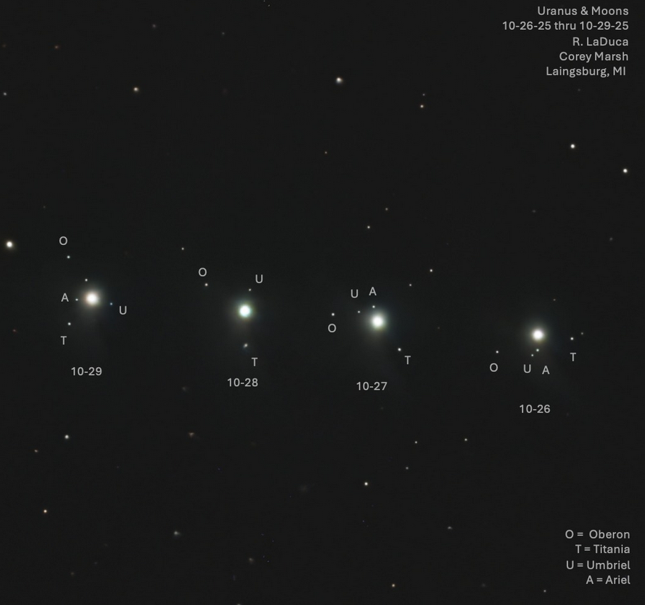 اورانوس با قدر ۵٫۶ در ثور، چهار درجه پایینتر از پروین قرار دارد و در تلسکوپ نقطهای آبیرنگ است. چهار قمر بزرگش — آریل، آمبریل، تیتانیا و اوبرون — همچون رشتهای محو در مدارش دیده میشوند.